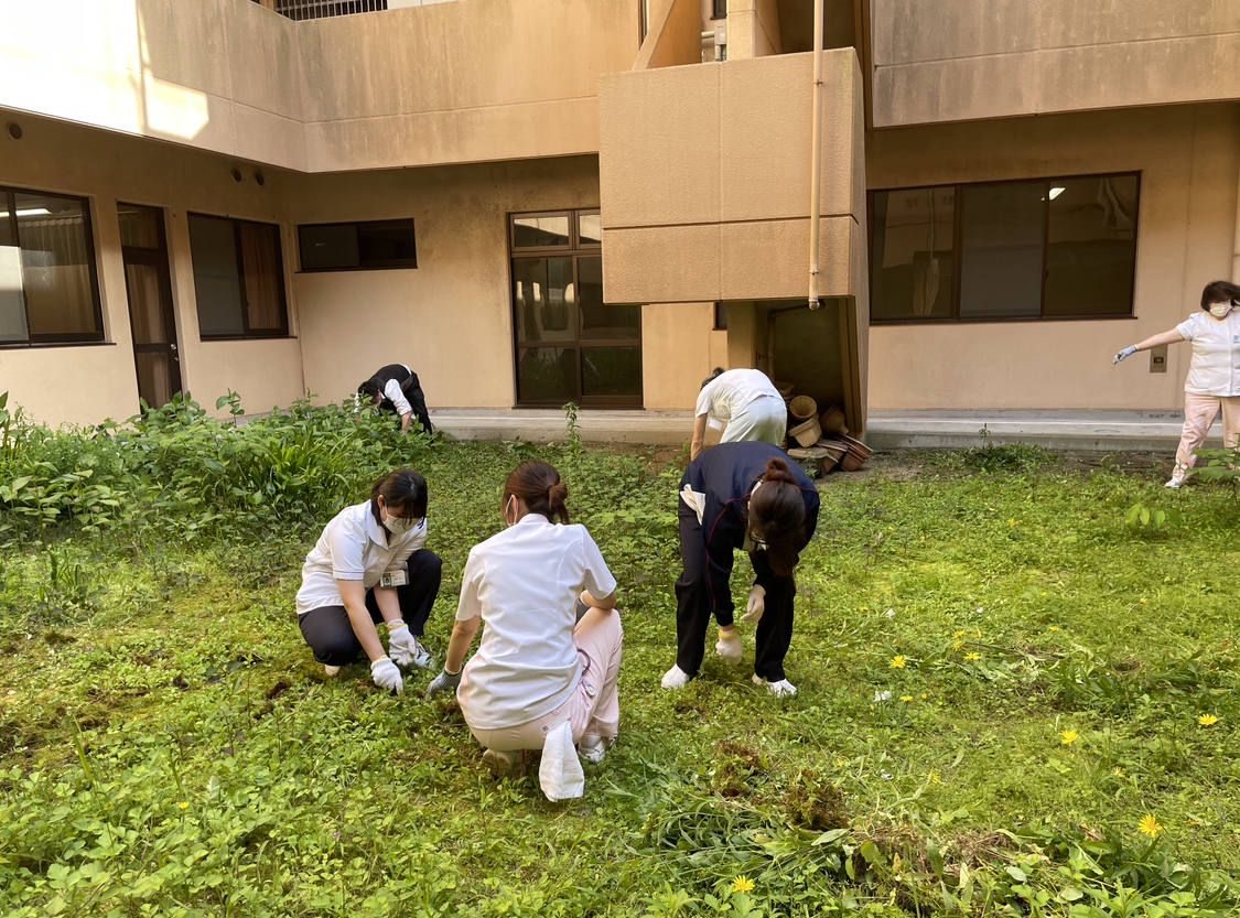 神出病院では、これまで患者サービス向上委員会が中心になりながら、職員で協力して中庭の手入れを行ってきました。2年前は、まず中庭の草抜きから始め、去年は花壇にタピアンを植え、その後もヒマワリやマリーゴールドなどのお花を植えて手入れを続けていました。